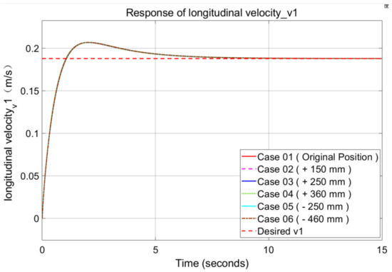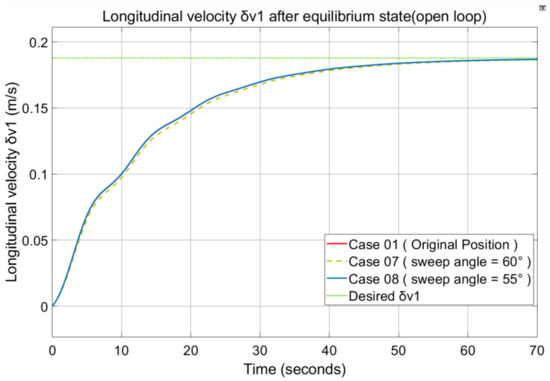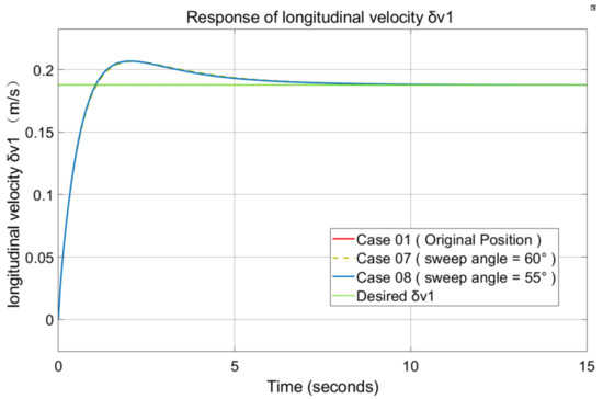 Response of the longitudinal velocity () with controller (cases 01, 07 and 08).