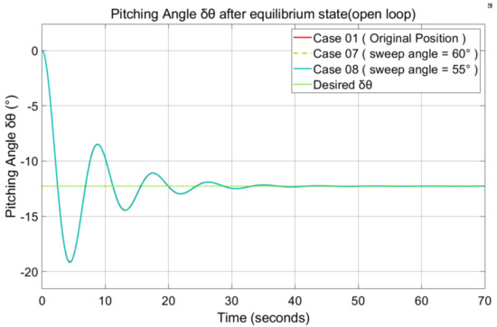 Figure 22, Figure 23, Figure 24 and Figure 25 detail the simulation results for open and closed loop for Cases 01, 07, and 08. Figure 22 and Figure 23 reflect the responses of the pitch angle () and longitudinal velocity () after setting a target and assigning various inputs to individual cases. The three cases exhibited similar behavior. Figure 24 and Figure 25 illustrate the response of the UG in terms of angle and velocity because of the action of the controller. Figure 24 displays the response state of the pitch angle () for a disturbance. The response trend is similar for each case. The controller can control the operating state of the glider satisfactorily even if the disturbance is present. The shape of the fixed wing did not affect the glider control response, as displayed in Figure 24 and Figure 25. Because of the approximate symmetry of dive and surfacing, control simulations were performed only for the dive phase.