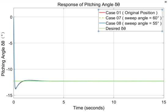Response of the pitching Angle () with controller (cases 01, 07 and 08).