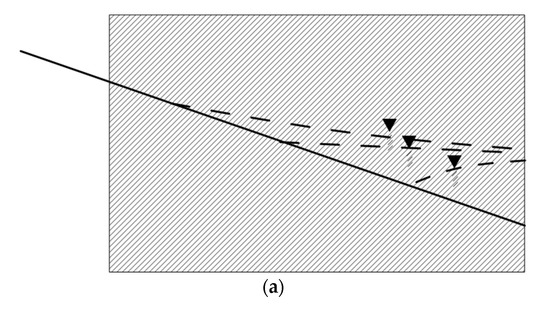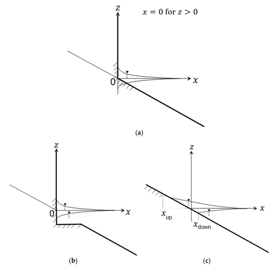 The formulation of equations to describe edge waves includes governing equations and boundary conditions. The onshore boundary condition is especially important as it defines the characteristics of an edge wave. Any kind of folding of the bed boundary, such as that shown in Figure 1a,b deteriorates the behavior of an edge wave. We focus on waves over a straight profile with a uniform slope, as shown in Figure 1c, where the onshore boundary limit meets the bed boundary.