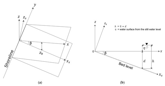 We use convenient, inclined coordinates () for the velocity-potential function, and we use the horizontal and vertical coordinates () for the displacement of the water surface from the still-water level, as shown in Figure 2.