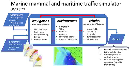 The primary goal of 3MTSim is to test management scenarios to mitigate the impact of marine traffic on whales [14,15]. Several modules of 3MTSim have already been described [10,11,16,17], so we provided an overview below of the main modules that were improved to come up with the version of the simulator used in this study.