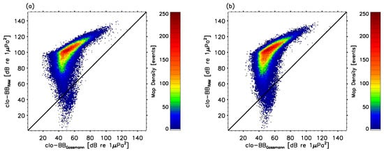 Density plot of the point-to-point comparison of the clo-BB vs. clo-BB predictions for (a) the upper half (or training subsample) of the GT simulation and timestep numbers not divisible by 10 between 1440 and 5040 (see text), and (b) the lower half (or testing sub-sample) of the GT simulation and timestep numbers not divisible by 10 between 5041 and 10,080 (see text). A binsize of 1 dB was used to process the square maps with colored density levels between 0 and 250 counts.