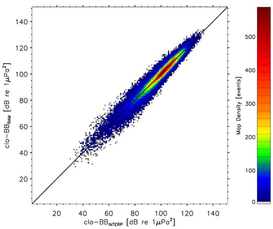 Density plot of the point-to-point comparison of the clo-BB vs. clo-BB predictions for the GT simulation for timestep numbers between 1440 and 10,080. A total of 214,438 ship-to-animal pairs are displayed. A binsize of 1 dB was used to process the square map with colored density levels between 0 and 500 counts.