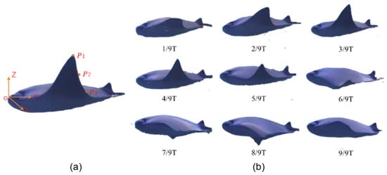 (a) Motion sequence diagram of manta robot with the pectoral fin feature points of manta ray; (b) Performance of forward swimming (after optimization).