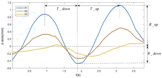 To further analyze the kinematics of the forward swimming of manta rays in the lateral view, three typical points on the pectoral fin of manta rays were selected for kinematic analysis. The coordinate system is established with the symmetrical center of the manta’s head as the origin of the coordinate system. The X-axis is the longitudinal direction of the pectoral fin, the Y-axis is the chordal direction of the trunk, and the Z-axis perpendicular to the trunk plane can be obtained according to the rule. When observed from the side view angle, the chordal motion of the feature point is mainly reflected in the Z-axis motion, and the displacement change of the X-axis is negligible. The motion trajectory of the feature point is represented in Figure 2.