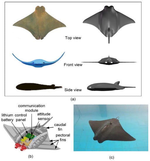 Manta ray robot design and build: (a) Three-view comparison of the manta ray robot and a manta ray; (b) The structure of the robot; (c) A physical photo of the manta ray robot in the pool.