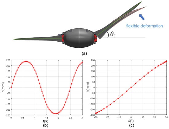 Substituting Equations (5) and (6) into Equation (4), the expression for the displacement of the endpoint of the root fin along the Z-axis direction is shown in Equation (7). The simulation results for are shown in Figure 4b,c.