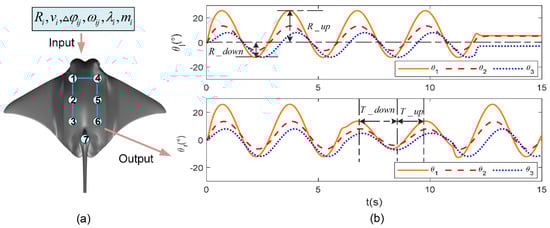 It can be seen from the simulation result that the oscillator successfully realizes the signal output of space asymmetry and time asymmetry, as shown in Figure 5b. The characteristics of the output waveform of the improved phase oscillator model have been preliminarily consistent with that of a real manta ray. To maintain similarity with the motion trajectory of the pectoral fin of a manta ray when it swims forward, the parameters in the oscillator need to be further optimized.