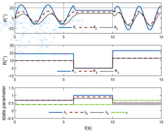 Firstly, the initial state of the CPG network is set as the space asymmetric coefficients , , and the time asymmetric coefficients . The time taken from the starting state to the steady state is about 1 s, realizing the asymmetric cruise state forward in time and space. Six seconds later, the above bias state is realized as the gliding state, and 10 s later the acceleration frequency is 0.67, the amplitude increases to , and the space asymmetric coefficients . The whole process simulates the common manta ray forward cruise. The effectiveness of the CPG bionic control established in this paper is verified, as shown in Figure 7.