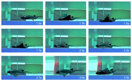 To verify the validity of the simulation, this paper conducts a forward swimming experiment with a manta ray robot. The manta ray robot was flapped with a space asymmetry factor of 0.7, the amplitude was set to 40°, and the frequency and phase difference were kept the same as the simulation settings. The motion frame diagram is shown in Figure 8 and the basic performance is shown in Figure 9.