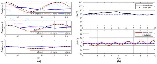 In order to verify the effectiveness of the optimization simulation, the optimized CPG parameters were applied to the manta ray robot to perform forward swimming experiments and obtain the posture and performance data of the robot. The forward swimming motion sequence frame diagram is shown in Figure 11. The motion trajectory of the fin tip point of the manta ray robot is similar to the real manta ray trajectory, which verifies the effectiveness of CPG asymmetric characteristic network construction and GAPSO optimization, as shown in Figure 12a. The error is mainly generated at the point . This point is the end of the first stage fin tip, and its flexible deformation is the largest at the beginning of the flutter. Thus, its error is the largest in the starting state. The specific motion pose similarity value is calculated; the similarity value of the improved motion pose at point is 80.96%, the similarity value at point is 85.33%, the similarity value at point is 99.30%, and the similarity value of the overall motion pose is 88.53%. Compared with the method of using manual settings of CPG parameters, the posture has been greatly improved, which verifies the effectiveness of this optimization, as shown in Table 3. Yet, the stability and maneuverability of the optimized robot were not significantly affected during forward swimming.