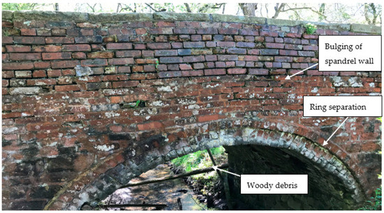 Masonry arch bridges are among the oldest bridge types and date back several thousand years. Although masonry arch construction became less popular towards the early part of the 20th century due to associated labour costs and the emerging technology of steel and concrete, this bridge form still constitutes a vital part of transport infrastructure networks worldwide. It is estimated that between 200,000 and 500,000 masonry arch bridges are in daily use in mainland Europe [7,8]. Approximately 35,000 in Germany, 78,000 in France, 56,800 in Italy and 17,867 in the UK are in the use of railway networks alone; the overall number is approximately 40,000 in the UK [9]. Existing masonry arch bridges show good performance under normal service loads; however, extreme environment loading with possible deterioration and ageing over time may limit the performance of these bridges spanning watercourses. A number of masonry arch bridges have been damaged or destroyed during the extreme flood events in the last two decades; some examples in the UK are given by Majtan et al. [6]. The damage and failure of masonry arch bridges causes disruption to transportation networks, communities and services; for example, Figure 1 shows a brickwork road bridge in Derbyshire, UK which was closed due to damage (ring separation and bulging of the spandrel wall) and requires remedial works to continue its service.
