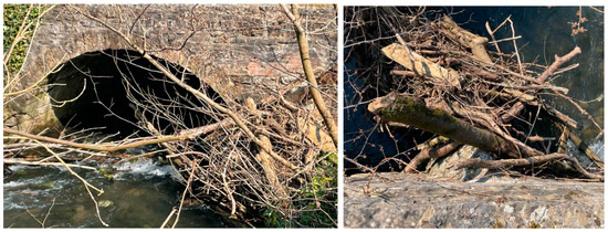 To assess these existing bridges in flood risk areas, the flood-induced loads on masonry arch bridges need to be quantified. These hydraulic actions at existing highway bridges are considered by the UK’s National Highways’ assessment code (CS 469, formerly BD 97/12) [10,11]; however, the main focus is the identification of scour effects and associated substructure behaviour of the bridge. Diehl [12] performed a detailed study to predict debris accumulation at bridges and US NCHRP report 445 [13] investigated debris forces on bridges with different drag coefficients associated with the flow–blockage ratio. However, none of these guidance or design codes [10,14,15] focused on masonry arch bridges and no specific equations for calculating forces on this bridge form are available [16]. Flood-induced loads on the structural components of a masonry arch bridge (abutment, arch barrel, spandrel wall) are different from those of other bridge forms, considering its geometry and structural behaviour.