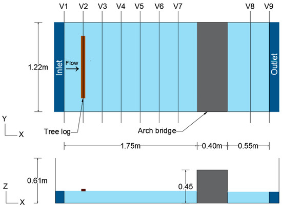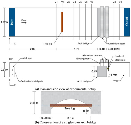 (a) Plan and side view of experimental setup with the velocity and water depth measurement locations of V1–V9 (not to scale) and (b) cross-section of a single-span arch bridge with tree log.
