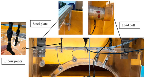 To suspend the bridge, four elbow joiners were used where movement was only allowed in the flow direction and restraint provided in other directions (Figure 4). Behind the bridge, on the downstream side, another beam was mounted to carry the steel plates and load cells used. The locations of the steel beams and load cells were parallel with respect to the longitudinal centreline of the bridge. The most important point here was to keep the distance between two aluminium beams used for the bridge and load cells the same.