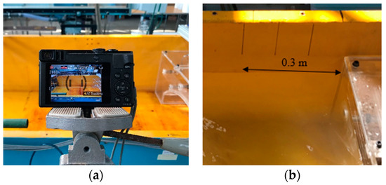 The debris motion was recorded using a Panasonic Lumix DMC-TZ71 camera at the side of the flume (Figure 5a). Videos of each test run were recorded at 50 frames per second (fps) with a resolution of 1920 × 1080 pixel. A video editor (Movavi) was used to adjust the frame rate and resolution if necessary, as well as to capture debris motion. Every 0.1 m with the total of 0.3 m upstream of the bridge was marked (Figure 5b) in order to estimate the debris velocity at the impact location by using the time from the videos recorded. Although no bias was observed in the flume based on preliminary experiments, the debris orientation at the impact location varied in the tests of each case. This might be due to human errors, considering no mechanical system was used for releasing the debris inside the water flow.
