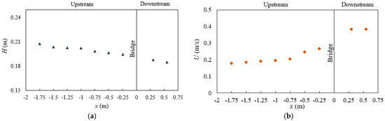 The free-surface and flume bottom levels were measured using a water depth gauge so as to obtain the water depth at the lateral centreline of the locations V1–V9. The water depth at the location V1 was 0.208 m with the 0.1 m-high weir at the outlet, 0.75 m downstream of the bridge rear wall. Figure 6a illustrates the water level elevations through the flume centreline in case 1 upstream and downstream of the bridge, regardless of the bridge width in the flow direction The measurement was taken every 0.25 m upstream representing with V1–V7, while the V8 was 0.3 m downstream of the bridge, due to the presence of the second aluminium beam used for the load cells, and the distance between V8 and V9 was 0.25 m. Repeatability analysis was conducted for each case to be able to provide the same hydraulic conditions, since a small instability occurred in this water depth, and velocity measurements related to the kinematics of the flow can nonetheless cause a significant scatter in pressure and force records [62,63]. Based on the analysis, the uncertainty of ±1.5 mm was observed in the water depth measurements.