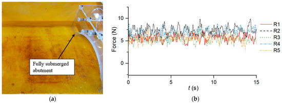 (a) Fully submerged abutment and (b) force–time histories in case 1, readings R1–R5.