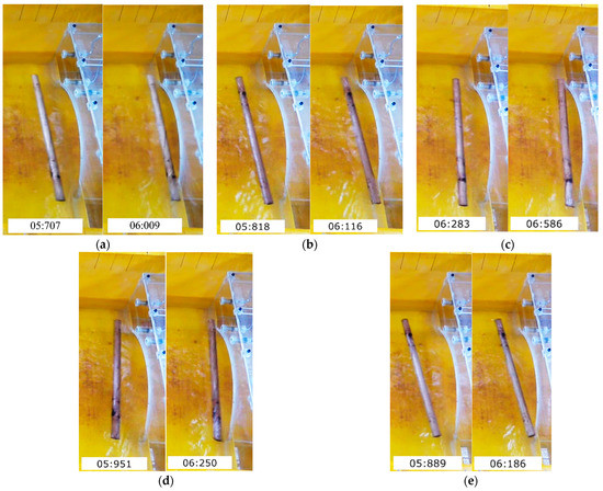 Figure 8a–e shows the snapshots from debris motion records in millisecond precision to estimate the debris velocity at the impact in case 2. The debris velocity was estimated according to its travelling time between these specific distances; thus, the debris velocity was calculated as 0.291 m/s and 0.331 m/s based on 0.3 m and 0.1 m distances, see Figure 5b and Figure 8a–e. Considering the increase in debris velocity close to the bridge, the 0.1 m distance was hereby used and relatively low COV was obtained (Table 3). The force–time histories are shown in Figure 9, the force including both hydrodynamic and debris impact load ranged between 32.94 N and 43.92 N, compared to the mean force obtained without debris of 6.19 N in case 1. The mean measured force with debris impact was therefore 6.25 times larger than the case without debris, equating to 6.25 times higher load. The impact durations in readings R1–R5 were obtained with 0.064 s, 0.081 s, 0.061 s, 0.087 s and 0.052 s. The SD and COV in the peak value of the debris impact were 4.00 N and 10.30%, respectively (Table 3).