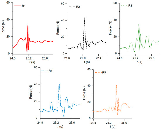 Force–time history at the debris impact, readings R1–R5.