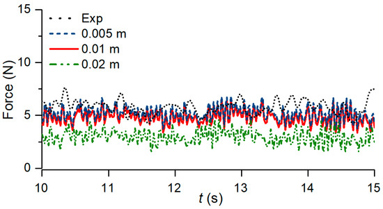 Although a detailed convergence study was provided based on both hydrostatic and hydrodynamic loads for preliminary results in the study of Majtan et al. [6], a convergence study was performed for case 1 to ensure sufficient model resolution with a new boundary condition. Although the dimensions of the impacted structure as well as debris needs to be a multiple of dp in DualSPHysics, three different particle resolutions were used considering the shortest dimension of the impacted bridge in case 1 without the presence of the debris: 0.02 m, 0.01 m and 0.005 m. All simulations were run for 15 s physical time. The drag force–time history is given in Figure 11, where the experimental result in reading R1 is presented. As can be seen in the results, decreasing the dp from 0.02 m to 0.01 m improved the accuracy significantly by decreasing the error from 38.29% to 17.61% based on the mean force of 6.19 N obtained in the experiment, while a slight increase was obtained in the accuracy using 0.005 m dp corresponding to 4.2 times more total particles in the numerical domain, and 7.5 times longer computational time compared to those with the dp of 0.01 m, as shown in Table 4. To optimise the model resolution, a particle size of 0.01 m was used in all simulations. Note that although decreasing the size of numerical domain compared to the preliminary study, using mDBC increased the total particles in the simulation.