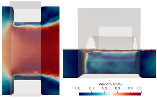 The smoothed particle hydrodynamics (SPH) method is employed in this study. The SPH theory, preliminary numerical setup, SPH parameters and GPU specifications used in the simulation and validation have been presented in detail by Majtan et al. [6]. The plan and side views of the numerical domain are given in Figure 10, where the inlet and outlet represent the V1 and V9 locations, respectively, in relation with the test area as well as computational efficiency. Following the experiment, a parabolic velocity profile with a free-surface velocity of 0.2 m/s and associated water depth were defined at the inlet, while water depth and constant velocity profile were imposed, considering the water depth measured at location V9 in the experiments and conservation of mass between these two locations. Note that the velocity profile measured at the location V9 was at the centreline of the flume width, which was not imposed at the outlet, considering its highest velocity value along location V9 and mass conservation. Note that the density was extrapolated at both the inlet and outlet. Considering recent development on the boundary conditions, the flume walls and bridge were created using the modified dynamic boundary condition (mDBC) rather than a dynamic boundary condition (DBC), while, due to limitations of the DualSPHysics code, the DBC was used for the floating object associated with available code in DualSPHysics v5.0 [64]. It should be emphasised that the main advantage of using mDBC in this research is to obtain pressure values on the structure without consideration of 1.5–2.0 h gap between solid and fluid particles [65,66], where h is the characteristic smoothing length. Since this gap size varies at each problem with each particle resolution, an accurate location needs to be defined to take pressure measurements.