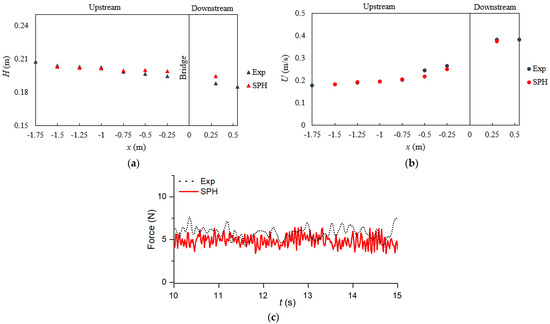 Figure 12 shows the velocity distribution at the end of the simulation upstream and downstream of the bridge in case 1 with a fully submerged abutment. It can be seen that the water height was slightly higher upstream of the bridge and velocity values increased significantly along the bridge span. Figure 13a,b illustrates the water level elevation and depth-averaged velocity profile in the x direction at the centreline of the flume in case 1. The physical properties (water depth and velocity) at the V1 and V9 locations were defined at the inlet and outlet, while these properties obtained at the V2–V8 locations were compared herein. The flume was perfectly horizontal without any slope. To obtain the desired velocity and water level elevation at V1, the weir height was adjusted. Due to the presence of the weir at the outlet close to the bridge with lower water level compared to that at the inlet, the water level elevation decreased in the x direction along the flume in the experiment. In the numerical model with a horizontal flume bed and different water depth imposed at the inlet and outlet, the flow depth was slightly higher in the SPH model, with a maximum error of 2.42%, and associated depth-averaged velocity was lower, with a maximum error of 11.52%. The drag force in case 1 (Figure 13c) was obtained with 17.61% error, compared to the mean RMS force of 6.19 N in the experiment.