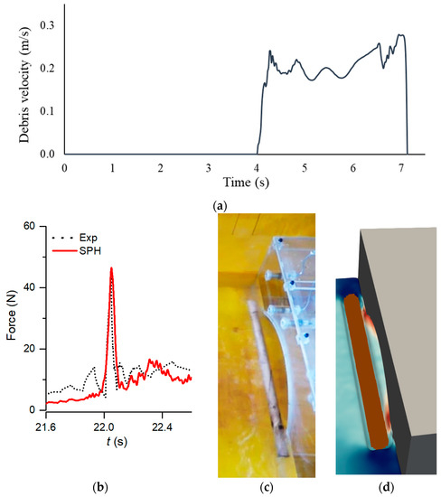 (a) Debris velocity–time history until the impact, (b) force–time history obtained in the SPH model vs. experiment (reading R2), (c) debris orientation at impact in the experiment (reading R1) and (d) SPH model in case 2.