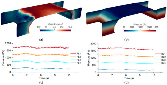 (a) Velocity and (b) pressure distributions on the bridge, (c) pressure–time histories on front and (d) back spandrel walls in case 1.