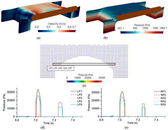 (a) Velocity and (b) pressure distributions on the bridge, (c) peak impact locations associated with the debris at t = 7.026 s in case 2 where the debris impact locations were numbered at the left (L) side of the bridge, (d) pressure–time histories at peak debris impact locations at left (L) side with LP1–LP5 and (e) at right (R) with RP1–RP5 between t = 6.8 s and t = 7.5 s.