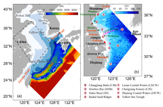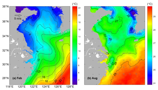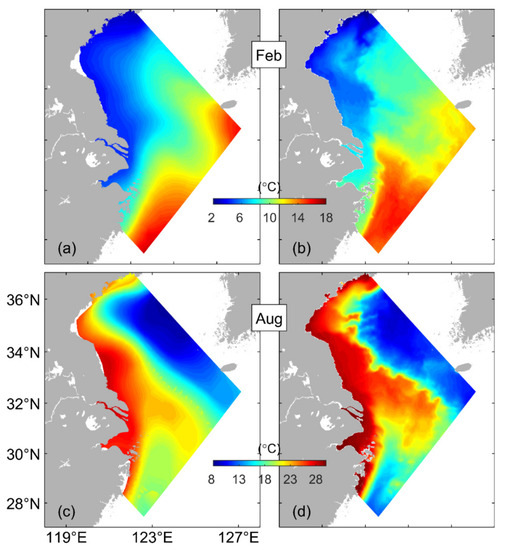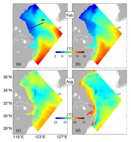 The hydrodynamics in the swYS was found to have significant seasonal variability [2,3,4]. The monthly mean oceanographic conditions in February and August are used in this paper to represent the winter and summer conditions. The February mean sea surface temperatures (SSTs) over the swYS (Figure 2a), inferred from the MURSST satellite remote sensing data over a 3-year period from 2014 to 16, vary from about 4 °C over the coastal waters off Shandong to about 14 °C in the deep waters around Jeju Island, with isotherms following approximately isobaths. The August mean SSTs during these 3 years are warm and in a range of 25–27 °C in the swYS (Figure 2b), with several patches of cold waters over the Subei Shoal (SS), HZB and Zhoushan Island [5,6]. The salinity over the swYS is affected by the spreading of low-salinity waters from the Changjiang (or Yangtze) River in both winter and summer months [7,8]. The Changjiang River is the largest river in China, which has an annual mean discharge of about s−1, with significant seasonal and synoptic variability [9]. Over the swYS, the low-salinity (<31 psu) water in February is mainly confined to the Subei Shoal, Changjiang Estuary (CJE) and Zhejiang Coastal Water (ZJCW), with the 31 psu isohaline reaching 123°E to the east [8]. In August, with the increased Changjiang River discharge (CRD) and the intensified southerly monsoon, the Changjiang plume spreads mainly to the northeast and almost the entire swYS is covered with low-salinity waters. In comparison with the February condition, the freshwater tongue extending along the Zhejiang coast is greatly restricted in August [7].