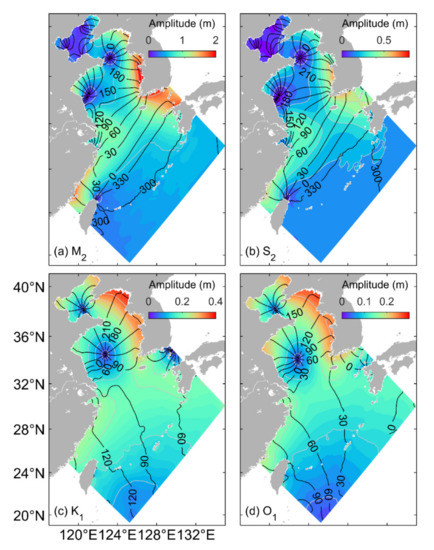 The TPXO model is calculated using the two-dimensional barotropic fluid equations, and assimilated by the satellite altimetry and in situ observation data [46]. The four major tide constituents (M2, S2, K1, O1) in the China Seas and adjacent deep waters are extracted from the 1/6° × 1/6° global TPXO models.