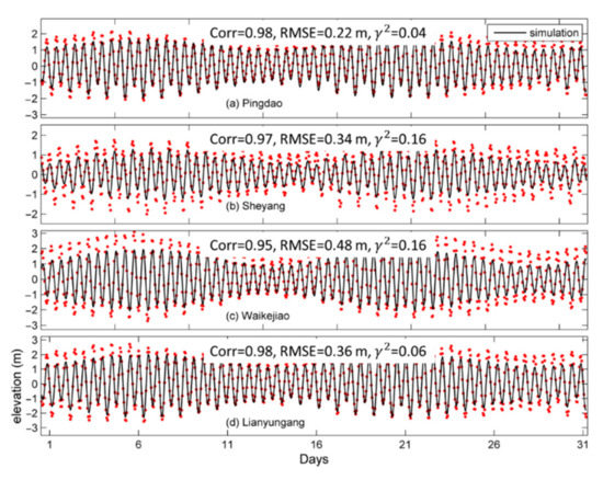 We next assess the model performance by comparing the simulated surface elevations produced by the inner model in the case of CR (Figure 4) with the observations made at four tidal gauge stations of Pingdao, Sheyang, Waikejiao and Lianyungang in July 2016 (their positions are marked in Figure 1b). Three statistical metrics: Correlation coefficient (Corr), RMSE and values [47] (Appendix C), are used to quantify the model performance. The correlation coefficients are about 0.98, 0.97, 0.95 and 0.98 at stations Pingdao, Sheyang, Waikejiao and Lianyungang, respectively. The RMSE values are about 0.22, 0.34, 0.48 and 0.36 m at these four stations, respectively. All these four RMSE values are smaller than 10 percent of the tidal range at these four stations, respectively. The values are about 0.04, 0.16, 0.16 and 0.06 at these four stations, respectively. This indicates that the inner model of the NGMS-swYS has satisfactory skill in simulating surface elevations over the swYS.