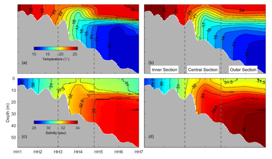 Vertical distribution of temperature (a,b) and salinity (c,d) along transect HH (locations shown in Figure 1) derived from (a,c) in situ observations made by scientists from Hohai University and (b,d) simulations produced by the inner model in the case of CR on 21 July 2016.