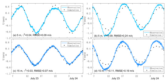Time series of (a,c) east-westward and (b,d) north-southward currents at 5 m and 15 m depths at station DD based on in situ observations (lines) made by scientists of Hohai University and simulated currents (black dots) produced by the inner model in case CR on 23 and 24 July 2016 (UTC+8 h). Positive values indicate eastward and northward directions, respectively.