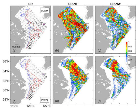 where and represent the monthly mean horizontal velocity vectors produced by the inner model in cases CR and NT, respectively, and is the amplitude of the vector. It should be noted that ( includes the currents driven directly by tidal forcing and the nonlinear interactions of tidal currents with wind-driven currents and density-driven currents. The above-mentioned nonlinear interactions could not be produced by the circulation model with the tidal forcing only. The impact index for wind forcing can be calculated in the same way as in Equation (1) by replacing with .