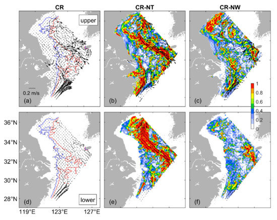 Distribution of monthly mean currents averaged in (a) the upper layer from the sea surface to 25 m and (d) the lower layer from 25 m to sea bottom in February 2015 calculated from the inner model results in the case of CR. The blue and red contours in (a,d) are isobaths of 30 m and 50 m, respectively. Distribution of impact index (, color image) and current differences (arrows) in (b,c) the upper layer and (e,f) the lower layer (b,e) between cases CR and NT and (c,f) between cases CR and NW. Vectors are plotted at every 9th grid point.