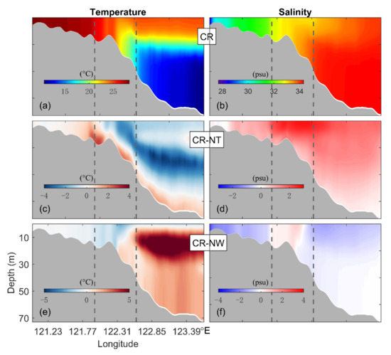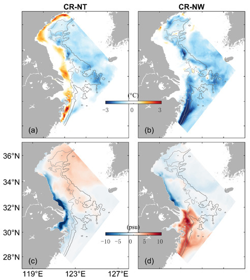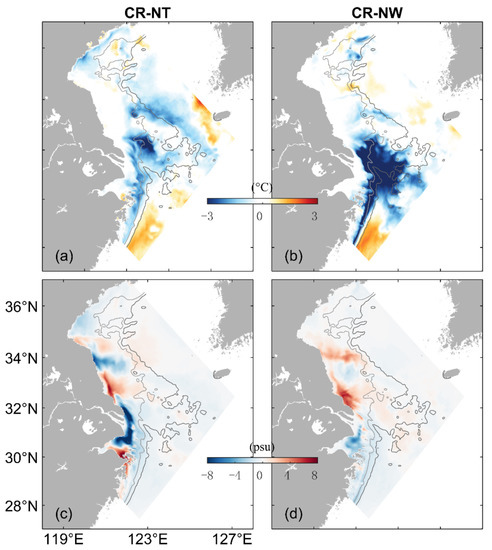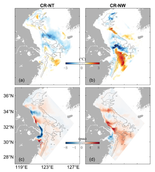 Figure 13b,d presents differences () in the February mean SBT and SBS between cases CR and NW. The large are negative and up to −3.5 °C over the CJB and the submarine canyon off the CJE (Figure 11b), due to the advection of cold water from northern YS to this region by WIMMCs and wind-induced mixing. The distribution of in this month is similar to over the SS, with positive values (up to 6.5 psu) over the coastal water off Rudong, positive values (up to 4.2 psu) over the coastal water off Sheyang and negative values (up to −2.0 psu) over the coastal water off Dafeng. The monthly mean SBS is weakly decreased (by up to 1.5 psu) over the main pathway of the TWC in this month due to the wind mixing between the subsurface high-salinity TWC water and surface low-salinity CRD.