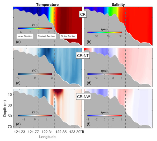 The simulated daily mean temperature and salinity on 21 July 2016 along transect HH produced by the inner model in the case of CR are compared with the hydrographic observations in Figure 7. The inner model reproduces very well the vertical distribution of observed temperature and salinity over the inner section of the transect (Figure 7b,d), with the simulated temperature (salinity) varying from 27.5 °C (29.2 psu) at HH1 to 23.2 °C (31.5 psu) at HH3 over the inner section of transect HH. The inner model also satisfactorily reproduces the observed upward climbing of bottom cold waters and the observed vertically uniform and horizontally stratified temperature and salinity below 20 m over the central section of the transect. Over the outer section of transect HH, the inner model reproduces reasonably well the uniform temperature and salinity in the surface layer of fewer than 5 m and the subsurface layer below 30 m. It should be noted that the thermocline in the model is too diffusive in comparison with observations, due mainly to a model deficiency [49].