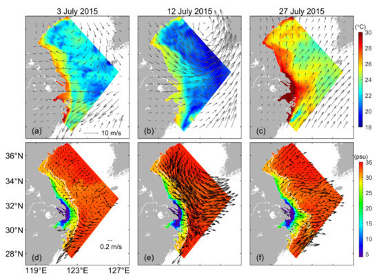 The values in February 2015 (Figure 12b) are negative and up to −3.0 °C over the CJB, due mainly to the advection of cold water from the northern YS to the CJB by WIMMCs. The values are positive and up to 2.8 °C over the main pathway of the TWC in this month, due mainly to the wind-induced vertical mixing between the cool surface water and warm TWC water. The values in this month (Figure 12d) are positive and up to 6.5 psu over the CJE and the coastal water off Rudong of China and positive and up to 4.8 psu over the coastal water off Sheyang of China. The values in this month are negative and up to −2.0 psu over the coastal water off Dafeng of China. The northerly winter monsoon blocks the northward transport of the CRD induced by TIMMCs; thus, the distribution and values of are opposite with the (Figure 12c,d).