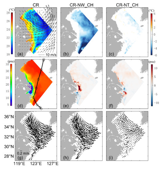 Distribution of negative values of in August (Figure 14b) demonstrates that the monthly mean SSTs are reduced by wind-induced vertical mixing over the entire swYS, except for the HZB and SS since the water temperatures are relatively warm and uniform over these regions. The large and negative values of over the LNCW (up to −1.0 °C), ZJCW (up to −3.0 °C) and waters off the SS (up to −2.3 °C) are associated with the wind-driven upwelling [6,10]. The values in this month (Figure 14d) are negative (up to −9.0 psu) over the northern and eastern part of the inner model domain and positive (up to 8.6 psu) over the CJE and ZJCW since the southwesterly winds block the southward transport of the CJP and push the CJP to extend northward.