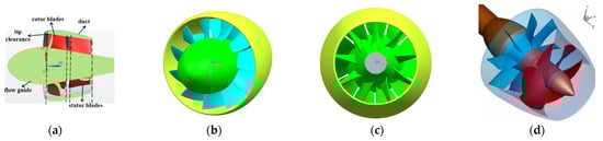 Figure 1 displays different geometric models of PJP. PJP can be classified into two different types depending on the stator: pre-swirl stator and pre-swirl rotor. Most previous studies have analyzed the pre-swirl-rotor-type PJP [,,,]. Herein, PJP is mainly applied in an AUV; thus, the pre-swirl-rotor-type PJP is considered herein. Tip clearance is located between the duct and rotor blades. Although the size of the tip clearance is very small, the flow field is very complicated, and it significantly impacts the flow field characteristics. The model parameters of PJP are shown in Table 1.