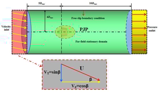 Compared to the study of the pure axial flow of the PJP, two methods can be used to numerically calculate the PJP under oblique flow conditions. In the first method, the position of the rotating domain is adjusted to adapt to the different oblique flow angles of the PJP []. In the second method, the velocity component of the coming flow is adjusted [,]. The two methods afford good calculation results, as shown in previous studies. However, the first method is tedious, and in it, each oblique flow angle condition needs to be adjusted in the PJP simulation model. To save the workload, the second method is adopted herein. The author compared the effects of these two boundary conditions, thus comparing the bearing force under the condition of oblique flow. It also can be seen from Figure 3 that the difference of vertical force under the two boundary conditions is relatively small []. Different oblique flow angles can be realized by changing the angle of attack of the incident flow of the horizontal plane x–z. Here, U denotes the inflow velocity, β denotes the oblique flow angle,  denotes the axial velocity component, and  denotes the tangential velocity component. The density of water is , the temperature of the water is set to 25 °C.