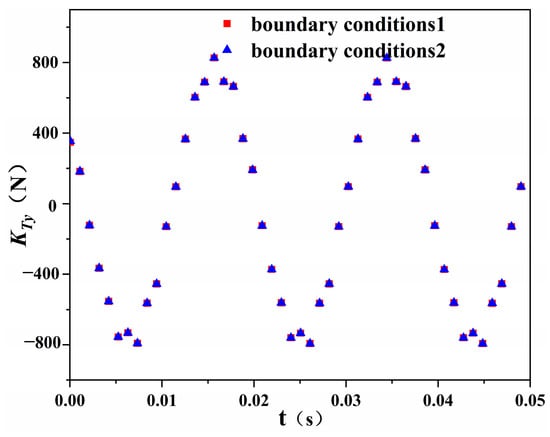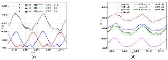 Figure 19c,d shows the difference of the axial force  at different cavitation numbers and different oblique angles. The axial force has a good periodicity in a certain time interval and the fluctuation amplitude is relatively small compared to the transverse force. For the lower oblique angles, the predicted value well agrees with the CFD value at the peak and trough positions of the axial force. For the higher oblique angle , the axial force at the trough exhibits a relatively large fluctuation compared to that for the lower oblique flow angles, and the difference between the predicted and CFD values is relatively large compared to that for the other two oblique flow working conditions. As shown in Figure 19d, the axial force has similar periodicity at the five different cavitation number conditions, and the predicted values of axial force agree well with the CFD values. Based on the above conclusions, CNN-Bi-LSTM has good generalization ability and can accurately predict the bearing force of a PJP at different oblique flow angles and different cavitation numbers.