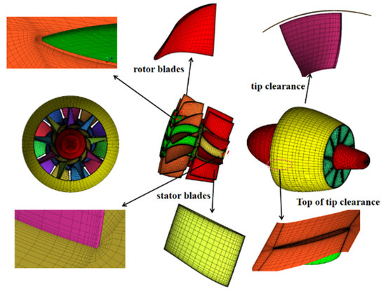 Figure 4 displays the detailed tip clearance grid and the detailed grid of the PJP. The duct wall can surround the axial HC-Block type grid and circumferential O-Block meshes. The O-Block meshes are used on the surface of the rotor and stator blades. The flow field between the tip clearance is more complicated compared to that in the other areas. Figure 4 shows that the grid of the tip clearance area is very dense, and thus, the double layers “O” topological mesh is adopted in this area to encrypt the grid. The height of the first grid is 4.1 × 10−5 m, which satisfied the y+ value (30–100) required by the turbulence model SST  (Section 2.3) under the high Reynolds number condition. The total number of grids is 1.662 × 107. In this study, Fluent in CFD software was used to calculate the cavitation flow field of PJP.