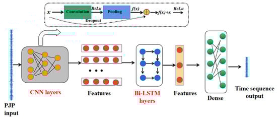 Deep learning methods have been employed in rotating machinery [,,]. Most of them use a single neural network, such as CNN and long and short-term memory network (LSTM). CNN can well extract local features in time or space, but it lacks the ability to learn the correlation of the time sequence, and thus, it cannot solve the problem of long-term dependence based on the considerable information. Although LSTM can solve the problem of long-term dependence, it does not fully consider the impact of future characteristic information as LSTM only reads the sequence data in one direction. Herein, a CNN-Bi-LSTM hybrid model is proposed that combines CNN and bidirectional LSTM (Bi-LSTM), fully utilizing both their respective advantages. Figure 5 displays the process of the CNN-Bi-LSTM hybrid model. The hyperparameter combination was obtained through various attempts, yielding high accuracy and generalization ability. Table 3 displays the parameters of the different layers.