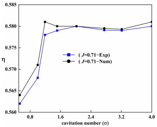 The cavitation model also affects the accuracy of the calculation results. The Z-G-B cavitation model has been used in many studies of PJP or propeller cavitation flow field [,,]. They have verified the validity of the Z-G-B cavitation model by using the E779A propeller with different J values [,]. The PJP model used in this study is the same as the PJP model of [,]. The Figure 9 shows the difference between CFD values and experimental values at different cavitation numbers. For different cavitation number conditions, the error of propulsion efficiency is relatively small between CFD value and experimental value. All errors are within 2%. The numerical simulation results well agree with the experimental data, which shows that the Z-G-B cavitation model can better simulate the cavitation flow field of PJP.