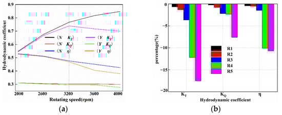 In this section, five rotating speed conditions (R1 = 2000 rpm, R2 = 2600 rpm, R3 = 3200 rpm, R4 = 3600 rpm, and R5 = 4000 rpm) are used to study the cavitation hydrodynamic performance at the oblique flow conditions (). As shown in Figure 10a,b, N and Y represent the non-cavitation and cavitation conditions, respectively. In Table 8,  represents the difference in the hydrodynamic parameter between the rotating speeds R2 and R1, and other symbols are similar to .