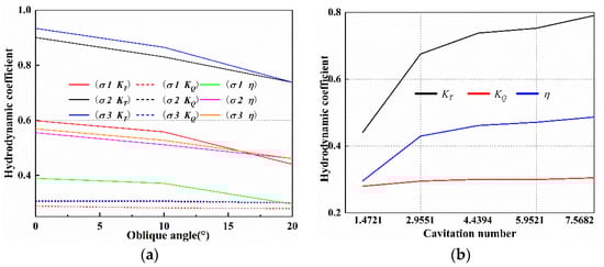 Generally, the three hydrodynamic coefficients of PJP decrease with increasing oblique angles. Table 10 shows that a smaller oblique angle, , has a relatively small effect on the open water efficiency at three cavitation numbers, with a maximum efficiency loss of only 7.88%. However, the propulsion efficiency significantly changes when , with the maximum efficiency loss exceeding 20%. Moreover, the three hydrodynamic coefficients of PJP increase with the cavitation number. For the open water efficiency , smaller cavitation numbers  have a greater impact on efficiency reduction than larger cavitation numbers. As shown in Table 10, the propulsion efficiency decreases by more than 37% regardless of the axial or oblique flow conditions when . This denotes that the PJP blades have a large cavitation area at . However, the difference in the efficiencies between  and  is relatively small; the biggest difference in efficiency is only 3.12%, which occurs at the oblique angle of . Although the cavitation number considerably influences the PJP efficiency, the total torque coefficient remains relatively consistent at different cavitation numbers. Under the three cavitation number conditions, the total torque coefficient only slightly changes with the oblique angle. Figure 11b shows the changing trends of the hydrodynamic coefficient for five different cavitation numbers when . The total thrust coefficient  and efficiency  increase with the cavitation number, and the change range of  and  is relatively small after  exceeds . The smaller cavitation number  has a greater impact on the PJP hydrodynamic performance at oblique flow conditions.
